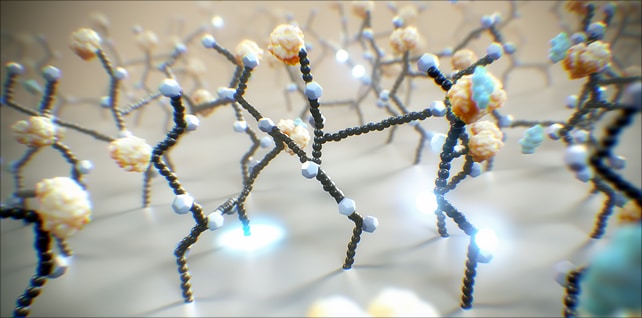 In this sequence, we zoom down to the surface of the flexible filament to get a closer look at the micro cross-linked polymer matrix environment. As the camera travels through the matrix, glucose molecules can be seen landing, leading to signaling down the length of the cross-linked polymer chain, and reaching the floor of the sensor electrode.
