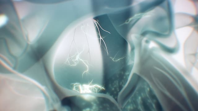The goal for this sequence: begin with a typical heart view, highlight the components of the cardiac conduction system, and eventually reveal the misfiring that is happening to the electrical system in the upper chamber.