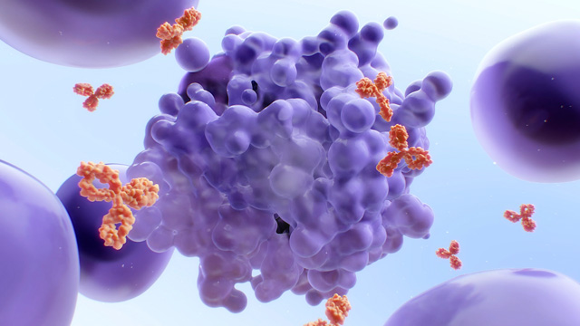 For this mechanism of action video, our task was to create a science story that would depict several key features: how the mAb finds and binds to myeloma cells and exposes them for elimination, how it boosts cells of the immune system, and how this targeted immunotherapy can kill myeloma cells directly.