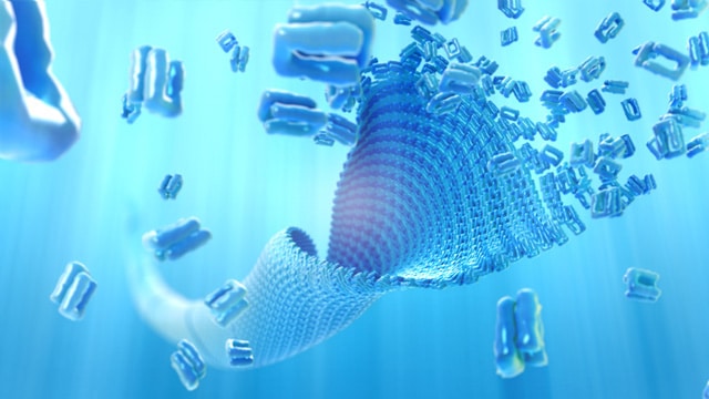 This is a sequence from a 3-minute animation that examines a unique formulation for building an effective therapy using the latest in nanotechnology, including monomers that organize into a controlled, self-assembling nanotube.