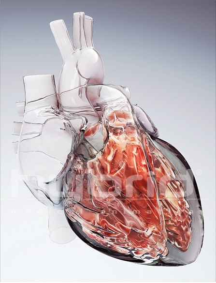 An animation of this heart also appears in the 2008 promotional reel and in the Hybrid Interactive Heart, where the viewer controls the ability to blend between “normal” opaque tissue and this refractory glass appearance. This allows for a unique vantage of the valves and chambers.