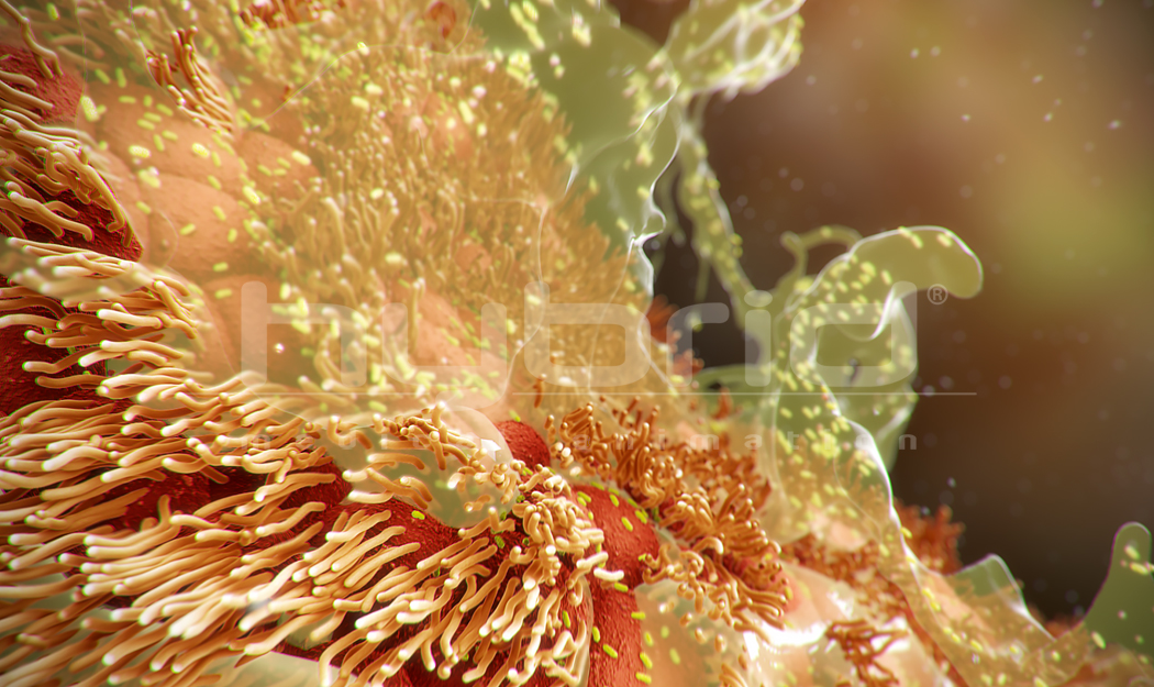 Micro-landscape view of respiratory cells and Bordetella pertussis bacteria.