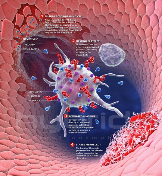 The scene setting and characters involved in the illustration were developed in such a way that would allow for their easy integration into a 5 ½ minute MOA animation centered on the evolving model of hemostasis and the NovoSeven® mechanism of action.