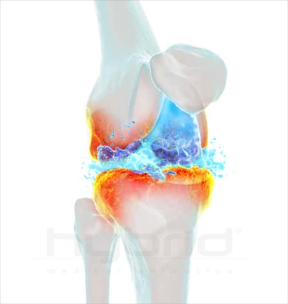 Conceptual illustration of a new product (a novel hyaluronic acid formulation) washing into a knee joint, filling the space and coating the joint.