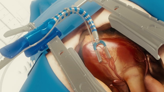 In this example, we set up motion-tracking controllers which enable the viewer to have “hands” in virtual space. The user can now point at and discuss the anastomotic site in greater detail, and elaborate on device design features such as the articulating arm, accommodation of positioning, and flexibility of the tissue stabilizer.